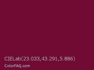 CIELab 23.033,43.291,5.886 Color is a dark rose color and the nearest color is Black Rose #67032d. Hex code #6f0a30 and RGB value is rgb(111,10,48). In RGB color space, this color is composed of 44% red, 4% green, 19% blue, In CMYK color space, this color is composed of 0% cyan, 91% magenta, 57% yellow , 56% black , In HSL color space, this color has a hue angle of 337° , 83% saturation and 24% lightness.