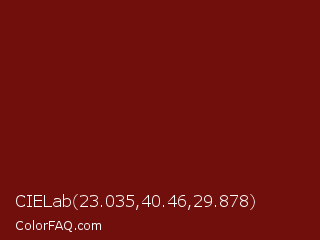 CIELab 23.035,40.46,29.878 Color is a dark red color and the nearest color is Dark Burgundy #770f05. Hex code #700f0b and RGB value is rgb(112,15,11). In RGB color space, this color is composed of 44% red, 6% green, 4% blue, In CMYK color space, this color is composed of 0% cyan, 87% magenta, 90% yellow , 56% black , In HSL color space, this color has a hue angle of 2° , 82% saturation and 24% lightness.