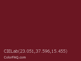 CIELab 23.051,37.596,15.455 Color is a dark red color and the nearest color is Persian Plum #701c1c. Hex code #6b1622 and RGB value is rgb(107,22,34). In RGB color space, this color is composed of 42% red, 9% green, 13% blue, In CMYK color space, this color is composed of 0% cyan, 79% magenta, 68% yellow , 58% black , In HSL color space, this color has a hue angle of 352° , 66% saturation and 25% lightness.