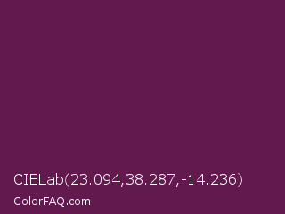 CIELab 23.094,38.287,-14.236 Color is a dark magenta color and the nearest color is Tawny Port #692545. Hex code #62194d and RGB value is rgb(98,25,77). In RGB color space, this color is composed of 38% red, 10% green, 30% blue, In CMYK color space, this color is composed of 0% cyan, 74% magenta, 21% yellow , 62% black , In HSL color space, this color has a hue angle of 317° , 59% saturation and 24% lightness.