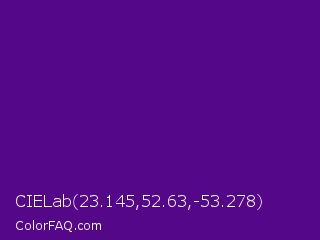 CIELab 23.145,52.63,-53.278 Color is a dark purple color and the nearest color is Pigment Indigo #4b0082. Hex code #540789 and RGB value is rgb(84,7,137). In RGB color space, this color is composed of 33% red, 3% green, 54% blue, In CMYK color space, this color is composed of 39% cyan, 95% magenta, 0% yellow , 46% black , In HSL color space, this color has a hue angle of 276° , 90% saturation and 28% lightness.