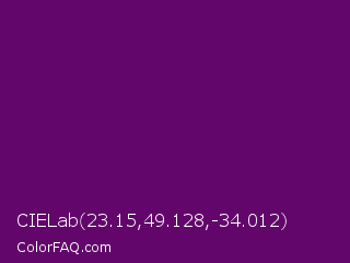 CIELab 23.15,49.128,-34.012 Color is a very dark magenta color and the nearest color is Honey Flower #4f1c70. Hex code #63066b and RGB value is rgb(99,6,107). In RGB color space, this color is composed of 39% red, 2% green, 42% blue, In CMYK color space, this color is composed of 7% cyan, 94% magenta, 0% yellow , 58% black , In HSL color space, this color has a hue angle of 295° , 89% saturation and 22% lightness.