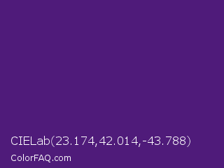 CIELab 23.174,42.014,-43.788 Color is a dark purple color and the nearest color is Honey Flower #4f1c70. Hex code #4f1b7a and RGB value is rgb(79,27,122). In RGB color space, this color is composed of 31% red, 11% green, 48% blue, In CMYK color space, this color is composed of 35% cyan, 78% magenta, 0% yellow , 52% black , In HSL color space, this color has a hue angle of 273° , 64% saturation and 29% lightness.