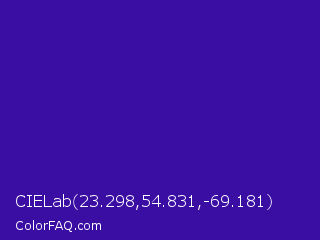CIELab 23.298,54.831,-69.181 Color is a normal indigo color and the nearest color is Blue Gem #2c0e8c. Hex code #3b0ea3 and RGB value is rgb(59,14,163). In RGB color space, this color is composed of 23% red, 5% green, 64% blue, In CMYK color space, this color is composed of 64% cyan, 91% magenta, 0% yellow , 36% black , In HSL color space, this color has a hue angle of 258° , 84% saturation and 35% lightness.
