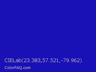 CIELab 23.383,57.521,-79.962 Color is a normal indigo color and the nearest color is Zaffre #0014a8. Hex code #1910b5 and RGB value is rgb(25,16,181). In RGB color space, this color is composed of 10% red, 6% green, 71% blue, In CMYK color space, this color is composed of 86% cyan, 91% magenta, 0% yellow , 29% black , In HSL color space, this color has a hue angle of 243° , 84% saturation and 39% lightness.