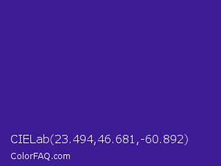 CIELab 23.494,46.681,-60.892 Color is a normal indigo color and the nearest color is Pixie Powder #391285. Hex code #3c1b96 and RGB value is rgb(60,27,150). In RGB color space, this color is composed of 24% red, 11% green, 59% blue, In CMYK color space, this color is composed of 60% cyan, 82% magenta, 0% yellow , 41% black , In HSL color space, this color has a hue angle of 256° , 69% saturation and 35% lightness.