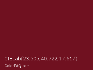 CIELab 23.505,40.722,17.617 Color is a dark red color and the nearest color is Persian Plum #701c1c. Hex code #701120 and RGB value is rgb(112,17,32). In RGB color space, this color is composed of 44% red, 7% green, 13% blue, In CMYK color space, this color is composed of 0% cyan, 85% magenta, 71% yellow , 56% black , In HSL color space, this color has a hue angle of 351° , 74% saturation and 25% lightness.