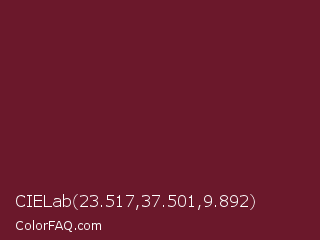 CIELab 23.517,37.501,9.892 Color is a dark red color and the nearest color is Persian Plum #701c1c. Hex code #6b182b and RGB value is rgb(107,24,43). In RGB color space, this color is composed of 42% red, 9% green, 17% blue, In CMYK color space, this color is composed of 0% cyan, 78% magenta, 60% yellow , 58% black , In HSL color space, this color has a hue angle of 346° , 63% saturation and 26% lightness.