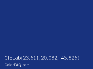 CIELab 23.611,20.082,-45.826 Color is a dark blue color and the nearest color is St Patricks Blue #23297a. Hex code #18327e and RGB value is rgb(24,50,126). In RGB color space, this color is composed of 9% red, 20% green, 49% blue, In CMYK color space, this color is composed of 81% cyan, 60% magenta, 0% yellow , 51% black , In HSL color space, this color has a hue angle of 225° , 68% saturation and 29% lightness.