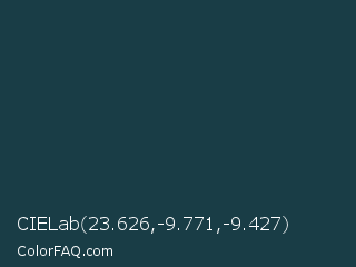 CIELab 23.626,-9.771,-9.427 Color is a very dark cyan color and the nearest color is Elephant #123447. Hex code #193d46 and RGB value is rgb(25,61,70). In RGB color space, this color is composed of 10% red, 24% green, 27% blue, In CMYK color space, this color is composed of 64% cyan, 13% magenta, 0% yellow , 73% black , In HSL color space, this color has a hue angle of 192° , 47% saturation and 19% lightness.