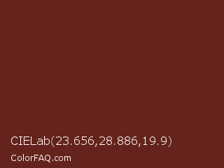 CIELab 23.656,28.886,19.9 Color is a dark red color and the nearest color is Espresso #612718. Hex code #64231c and RGB value is rgb(100,35,28). In RGB color space, this color is composed of 39% red, 14% green, 11% blue, In CMYK color space, this color is composed of 0% cyan, 65% magenta, 72% yellow , 61% black , In HSL color space, this color has a hue angle of 6° , 56% saturation and 25% lightness.