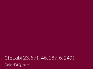 CIELab 23.671,46.187,6.249 Color is a dark rose color and the nearest color is Siren #7a013a. Hex code #740331 and RGB value is rgb(116,3,49). In RGB color space, this color is composed of 45% red, 1% green, 19% blue, In CMYK color space, this color is composed of 0% cyan, 97% magenta, 58% yellow , 55% black , In HSL color space, this color has a hue angle of 336° , 95% saturation and 23% lightness.