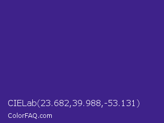 CIELab 23.682,39.988,-53.131 Color is a normal indigo color and the nearest color is Spanish Violet #4c2882. Hex code #3e228a and RGB value is rgb(62,34,138). In RGB color space, this color is composed of 24% red, 13% green, 54% blue, In CMYK color space, this color is composed of 55% cyan, 75% magenta, 0% yellow , 46% black , In HSL color space, this color has a hue angle of 256° , 60% saturation and 34% lightness.