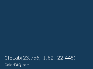CIELab 23.756,-1.62,-22.448 Color is a very dark blue color and the nearest color is Cello #1e385b. Hex code #153b5a and RGB value is rgb(21,59,90). In RGB color space, this color is composed of 8% red, 23% green, 35% blue, In CMYK color space, this color is composed of 77% cyan, 34% magenta, 0% yellow , 65% black , In HSL color space, this color has a hue angle of 207° , 62% saturation and 22% lightness.