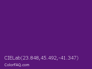 CIELab 23.848,45.492,-41.347 Color is a dark purple color and the nearest color is Honey Flower #4f1c70. Hex code #591678 and RGB value is rgb(89,22,120). In RGB color space, this color is composed of 35% red, 9% green, 47% blue, In CMYK color space, this color is composed of 26% cyan, 82% magenta, 0% yellow , 53% black , In HSL color space, this color has a hue angle of 281° , 69% saturation and 28% lightness.