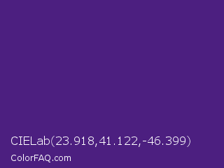 CIELab 23.918,41.122,-46.399 Color is a normal violet color and the nearest color is Spanish Violet #4c2882. Hex code #4c1f80 and RGB value is rgb(76,31,128). In RGB color space, this color is composed of 30% red, 12% green, 50% blue, In CMYK color space, this color is composed of 41% cyan, 76% magenta, 0% yellow , 50% black , In HSL color space, this color has a hue angle of 268° , 61% saturation and 31% lightness.