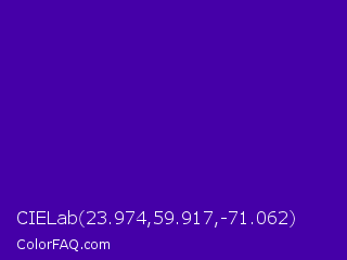 CIELab 23.974,59.917,-71.062 Color is a normal violet color and the nearest color is Purple #660099. Hex code #4500a8 and RGB value is rgb(69,0,168). In RGB color space, this color is composed of 27% red, 0% green, 66% blue, In CMYK color space, this color is composed of 59% cyan, 100% magenta, 0% yellow , 34% black , In HSL color space, this color has a hue angle of 265° , 100% saturation and 33% lightness.
