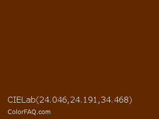 CIELab 24.046,24.191,34.468 Color is a very dark orange color and the nearest color is Carnaby Tan #5c2e01. Hex code #622800 and RGB value is rgb(98,40,0). In RGB color space, this color is composed of 38% red, 16% green, 0% blue, In CMYK color space, this color is composed of 0% cyan, 59% magenta, 100% yellow , 62% black , In HSL color space, this color has a hue angle of 24° , 100% saturation and 19% lightness.