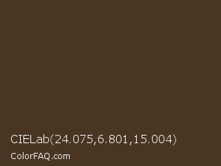 CIELab 24.075,6.801,15.004 Color is a very dark orange color and the nearest color is Black Coffee #4b3621. Hex code #4a3523 and RGB value is rgb(74,53,35). In RGB color space, this color is composed of 29% red, 21% green, 14% blue, In CMYK color space, this color is composed of 0% cyan, 28% magenta, 53% yellow , 71% black , In HSL color space, this color has a hue angle of 28° , 36% saturation and 21% lightness.