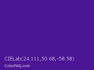 CIELab 24.111,50.68,-58.58 Color is a normal violet color and the nearest color is Daisy Bush #4f2398. Hex code #4b1494 and RGB value is rgb(75,20,148). In RGB color space, this color is composed of 29% red, 8% green, 58% blue, In CMYK color space, this color is composed of 49% cyan, 86% magenta, 0% yellow , 42% black , In HSL color space, this color has a hue angle of 266° , 76% saturation and 33% lightness.