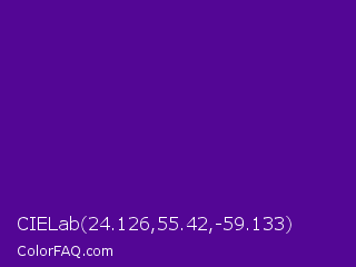 CIELab 24.126,55.42,-59.133 Color is a dark purple color and the nearest color is Purple #660099. Hex code #530695 and RGB value is rgb(83,6,149). In RGB color space, this color is composed of 33% red, 2% green, 58% blue, In CMYK color space, this color is composed of 44% cyan, 96% magenta, 0% yellow , 42% black , In HSL color space, this color has a hue angle of 272° , 92% saturation and 30% lightness.
