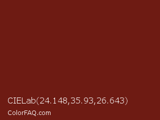 CIELab 24.148,35.93,26.643 Color is a dark red color and the nearest color is Moccaccino #6e1d14. Hex code #6e1b13 and RGB value is rgb(110,27,19). In RGB color space, this color is composed of 43% red, 11% green, 7% blue, In CMYK color space, this color is composed of 0% cyan, 75% magenta, 83% yellow , 57% black , In HSL color space, this color has a hue angle of 5° , 71% saturation and 25% lightness.