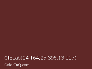 CIELab 24.164,25.398,13.117 Color is a dark red color and the nearest color is Caput Mortuum #592720. Hex code #602827 and RGB value is rgb(96,40,39). In RGB color space, this color is composed of 38% red, 16% green, 15% blue, In CMYK color space, this color is composed of 0% cyan, 58% magenta, 59% yellow , 62% black , In HSL color space, this color has a hue angle of 1° , 42% saturation and 26% lightness.