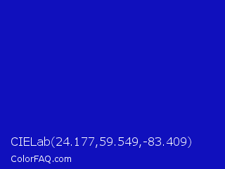 CIELab 24.177,59.549,-83.409 Color is a normal blue color and the nearest color is Dark Blue #0000c8. Hex code #1010bd and RGB value is rgb(16,16,189). In RGB color space, this color is composed of 6% red, 6% green, 74% blue, In CMYK color space, this color is composed of 92% cyan, 92% magenta, 0% yellow , 26% black , In HSL color space, this color has a hue angle of 240° , 84% saturation and 40% lightness.