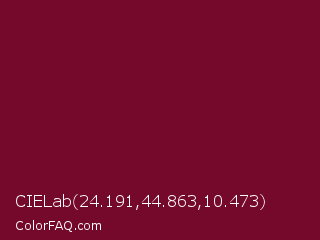 CIELab 24.191,44.863,10.473 Color is a dark rose color and the nearest color is Black Rose #67032d. Hex code #75092c and RGB value is rgb(117,9,44). In RGB color space, this color is composed of 46% red, 4% green, 17% blue, In CMYK color space, this color is composed of 0% cyan, 92% magenta, 62% yellow , 54% black , In HSL color space, this color has a hue angle of 341° , 86% saturation and 25% lightness.