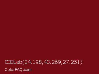 CIELab 24.198,43.269,27.251 Color is a dark red color and the nearest color is UP Maroon #7b1113. Hex code #760c13 and RGB value is rgb(118,12,19). In RGB color space, this color is composed of 46% red, 5% green, 7% blue, In CMYK color space, this color is composed of 0% cyan, 90% magenta, 84% yellow , 54% black , In HSL color space, this color has a hue angle of 356° , 82% saturation and 25% lightness.