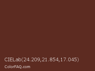 CIELab 24.209,21.854,17.045 Color is a dark red color and the nearest color is Caput Mortuum #592720. Hex code #5d2b21 and RGB value is rgb(93,43,33). In RGB color space, this color is composed of 36% red, 17% green, 13% blue, In CMYK color space, this color is composed of 0% cyan, 54% magenta, 65% yellow , 64% black , In HSL color space, this color has a hue angle of 10° , 48% saturation and 25% lightness.