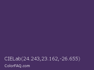 CIELab 24.243,23.162,-26.655 Color is a dark violet color and the nearest color is Bossanova #4e2a5a. Hex code #472e62 and RGB value is rgb(71,46,98). In RGB color space, this color is composed of 28% red, 18% green, 38% blue, In CMYK color space, this color is composed of 28% cyan, 53% magenta, 0% yellow , 62% black , In HSL color space, this color has a hue angle of 269° , 36% saturation and 28% lightness.