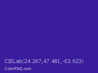 CIELab 24.267,47.481,-63.923 Color is a normal indigo color and the nearest color is Blue Pigment #333399. Hex code #391d9d and RGB value is rgb(57,29,157). In RGB color space, this color is composed of 22% red, 11% green, 62% blue, In CMYK color space, this color is composed of 64% cyan, 82% magenta, 0% yellow , 38% black , In HSL color space, this color has a hue angle of 253° , 69% saturation and 36% lightness.