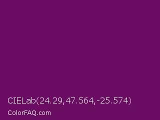 CIELab 24.29,47.564,-25.574 Color is a dark magenta color and the nearest color is French Plum #811453. Hex code #6a0c61 and RGB value is rgb(106,12,97). In RGB color space, this color is composed of 42% red, 5% green, 38% blue, In CMYK color space, this color is composed of 0% cyan, 89% magenta, 8% yellow , 58% black , In HSL color space, this color has a hue angle of 306° , 80% saturation and 23% lightness.