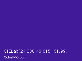 CIELab 24.308,48.815,-61.99 Color is a normal indigo color and the nearest color is Daisy Bush #4f2398. Hex code #411a9a and RGB value is rgb(65,26,154). In RGB color space, this color is composed of 25% red, 10% green, 60% blue, In CMYK color space, this color is composed of 58% cyan, 83% magenta, 0% yellow , 40% black , In HSL color space, this color has a hue angle of 258° , 71% saturation and 35% lightness.