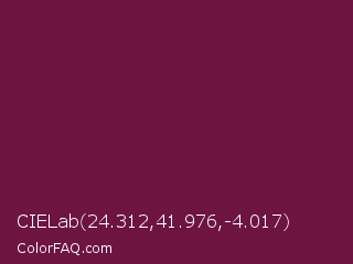 CIELab 24.312,41.976,-4.017 Color is a dark rose color and the nearest color is Pansy Purple #78184a. Hex code #6e1441 and RGB value is rgb(110,20,65). In RGB color space, this color is composed of 43% red, 8% green, 25% blue, In CMYK color space, this color is composed of 0% cyan, 82% magenta, 41% yellow , 57% black , In HSL color space, this color has a hue angle of 330° , 69% saturation and 25% lightness.