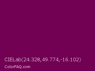 CIELab 24.328,49.774,-16.102 Color is a very dark magenta color and the nearest color is Pompadour #660045. Hex code #720053 and RGB value is rgb(114,0,83). In RGB color space, this color is composed of 45% red, 0% green, 33% blue, In CMYK color space, this color is composed of 0% cyan, 100% magenta, 27% yellow , 55% black , In HSL color space, this color has a hue angle of 316° , 100% saturation and 22% lightness.