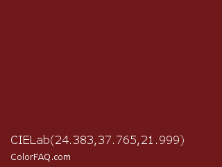 CIELab 24.383,37.765,21.999 Color is a dark red color and the nearest color is Persian Plum #701c1c. Hex code #70191b and RGB value is rgb(112,25,27). In RGB color space, this color is composed of 44% red, 10% green, 11% blue, In CMYK color space, this color is composed of 0% cyan, 78% magenta, 76% yellow , 56% black , In HSL color space, this color has a hue angle of 359° , 64% saturation and 27% lightness.