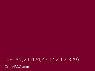 CIELab 24.424,47.612,12.329 Color is a dark rose color and the nearest color is Burgundy #800020. Hex code #79002a and RGB value is rgb(121,0,42). In RGB color space, this color is composed of 47% red, 0% green, 16% blue, In CMYK color space, this color is composed of 0% cyan, 100% magenta, 65% yellow , 53% black , In HSL color space, this color has a hue angle of 339° , 100% saturation and 24% lightness.