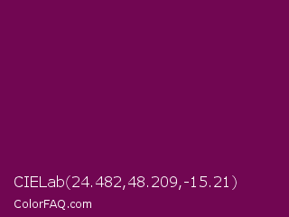 CIELab 24.482,48.209,-15.21 Color is a dark magenta color and the nearest color is Pompadour #660045. Hex code #710652 and RGB value is rgb(113,6,82). In RGB color space, this color is composed of 44% red, 2% green, 32% blue, In CMYK color space, this color is composed of 0% cyan, 95% magenta, 27% yellow , 56% black , In HSL color space, this color has a hue angle of 317° , 90% saturation and 23% lightness.