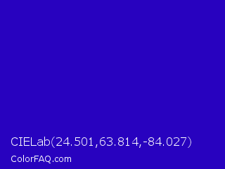 CIELab 24.501,63.814,-84.027 Color is a normal indigo color and the nearest color is Interdimensional Blue #360ccc. Hex code #2802bf and RGB value is rgb(40,2,191). In RGB color space, this color is composed of 16% red, 1% green, 75% blue, In CMYK color space, this color is composed of 79% cyan, 99% magenta, 0% yellow , 25% black , In HSL color space, this color has a hue angle of 252° , 98% saturation and 38% lightness.