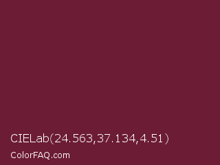 CIELab 24.563,37.134,4.51 Color is a dark rose color and the nearest color is Tawny Port #692545. Hex code #6c1c35 and RGB value is rgb(108,28,53). In RGB color space, this color is composed of 42% red, 11% green, 21% blue, In CMYK color space, this color is composed of 0% cyan, 74% magenta, 51% yellow , 58% black , In HSL color space, this color has a hue angle of 341° , 59% saturation and 27% lightness.
