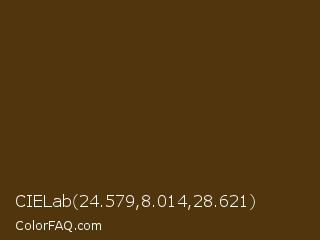 CIELab 24.579,8.014,28.621 Color is a very dark orange color and the nearest color is Pineapple #563c0d. Hex code #50350d and RGB value is rgb(80,53,13). In RGB color space, this color is composed of 31% red, 21% green, 5% blue, In CMYK color space, this color is composed of 0% cyan, 34% magenta, 84% yellow , 69% black , In HSL color space, this color has a hue angle of 36° , 72% saturation and 18% lightness.
