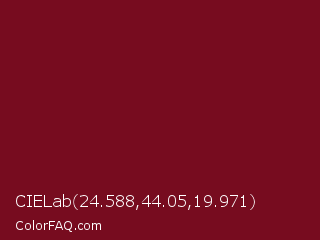 CIELab 24.588,44.05,19.971 Color is a dark red color and the nearest color is UP Maroon #7b1113. Hex code #770c1f and RGB value is rgb(119,12,31). In RGB color space, this color is composed of 47% red, 5% green, 12% blue, In CMYK color space, this color is composed of 0% cyan, 90% magenta, 74% yellow , 53% black , In HSL color space, this color has a hue angle of 349° , 82% saturation and 26% lightness.