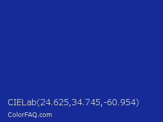 CIELab 24.625,34.745,-60.954 Color is a normal blue color and the nearest color is Torea Bay #0f2d9e. Hex code #182c99 and RGB value is rgb(24,44,153). In RGB color space, this color is composed of 9% red, 17% green, 60% blue, In CMYK color space, this color is composed of 84% cyan, 71% magenta, 0% yellow , 40% black , In HSL color space, this color has a hue angle of 231° , 73% saturation and 35% lightness.