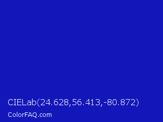 CIELab 24.628,56.413,-80.872 Color is a normal blue color and the nearest color is Blue Pantone #0018a8. Hex code #1317ba and RGB value is rgb(19,23,186). In RGB color space, this color is composed of 7% red, 9% green, 73% blue, In CMYK color space, this color is composed of 90% cyan, 88% magenta, 0% yellow , 27% black , In HSL color space, this color has a hue angle of 239° , 81% saturation and 40% lightness.