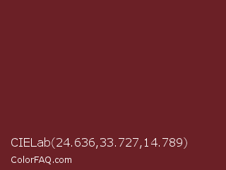 CIELab 24.636,33.727,14.789 Color is a dark red color and the nearest color is Persian Plum #701c1c. Hex code #6b2026 and RGB value is rgb(107,32,38). In RGB color space, this color is composed of 42% red, 13% green, 15% blue, In CMYK color space, this color is composed of 0% cyan, 70% magenta, 64% yellow , 58% black , In HSL color space, this color has a hue angle of 355° , 54% saturation and 27% lightness.