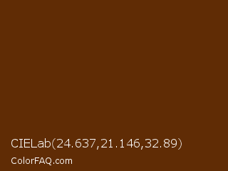 CIELab 24.637,21.146,32.89 Color is a very dark orange color and the nearest color is Carnaby Tan #5c2e01. Hex code #602c05 and RGB value is rgb(96,44,5). In RGB color space, this color is composed of 38% red, 17% green, 2% blue, In CMYK color space, this color is composed of 0% cyan, 54% magenta, 95% yellow , 62% black , In HSL color space, this color has a hue angle of 26° , 90% saturation and 20% lightness.