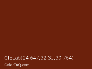 CIELab 24.647,32.31,30.764 Color is a dark red color and the nearest color is Moccaccino #6e1d14. Hex code #6c210c and RGB value is rgb(108,33,12). In RGB color space, this color is composed of 42% red, 13% green, 5% blue, In CMYK color space, this color is composed of 0% cyan, 69% magenta, 89% yellow , 58% black , In HSL color space, this color has a hue angle of 13° , 80% saturation and 24% lightness.