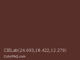 CIELab 24.693,18.422,12.279 Color is a dark red color and the nearest color is Buccaneer #622f30. Hex code #592f29 and RGB value is rgb(89,47,41). In RGB color space, this color is composed of 35% red, 18% green, 16% blue, In CMYK color space, this color is composed of 0% cyan, 47% magenta, 54% yellow , 65% black , In HSL color space, this color has a hue angle of 8° , 37% saturation and 25% lightness.
